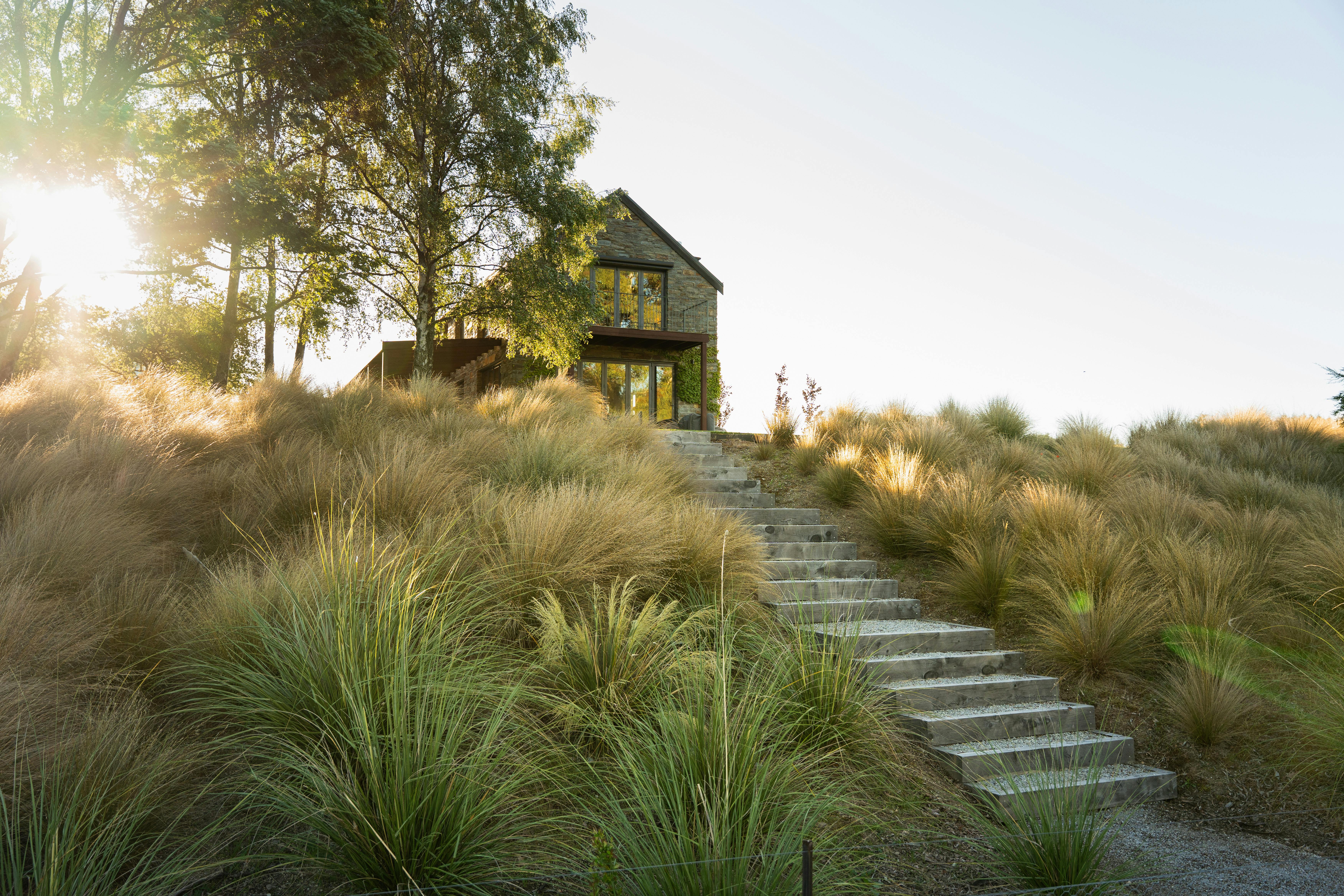 Expansive outdoor living areas, constructed of compacted gravel and edged with schist slabs, extend from the kitchen, dining, and living areas, establishing strong visual and physical connections with the surrounding gardens. Beyond the lawn, a carefully structured descent of hardwood and gravel steps integrates mass plantings of Red Tussock, Snow Tussock, and Coprosma, blending seamlessly into the protected Kānuka woodland beyond.